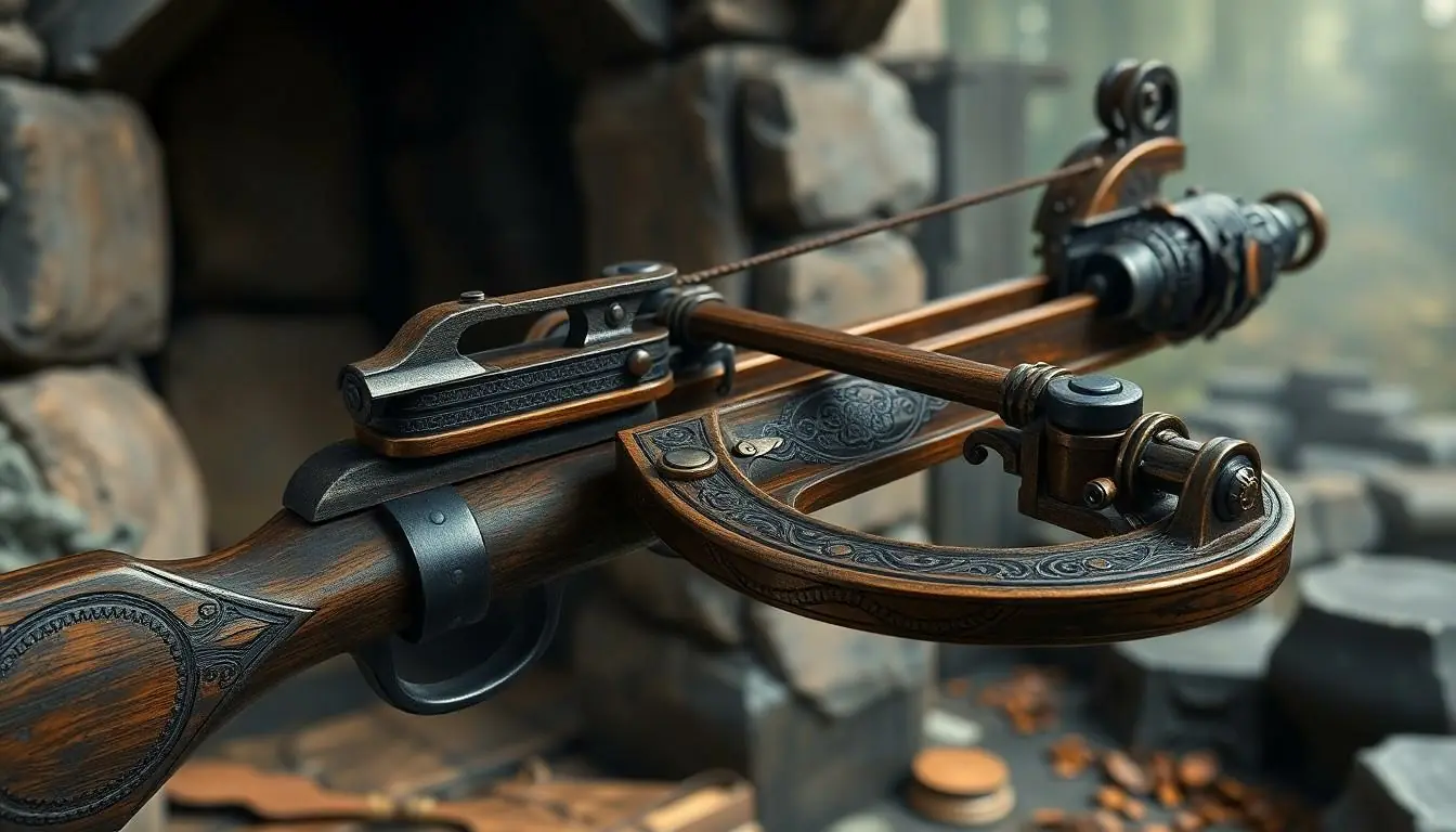 Equipped with unique features, the pulley crossbow allows for efficient bolt retrieval and quick reloading, enhancing strategic gameplay. The aesthetic design reflects medieval influences, contributing to immersion in the game world.